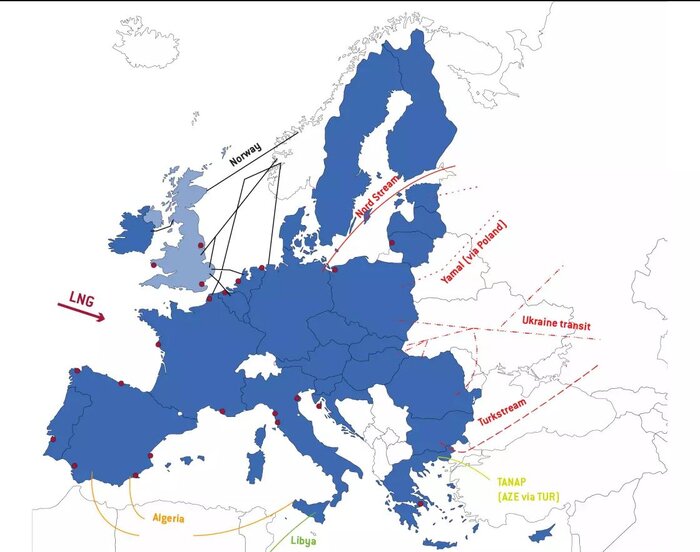 در شکل زیر مسیرهای واردات گاز به وسیله خط لوله و LNG را به اتحادیه اروپا نشان می‌دهد. بیشترین سهم انتقال گاز از روسیه در گذشته متعلق به چهار کریدور نورد استریم، یامال (از طریق لهستان)، اوکراین و ترک استریم (از طریق ترکیه) بود که اکنون در مرکز تنش‌های ژئوپلیتیک قرار دارند.