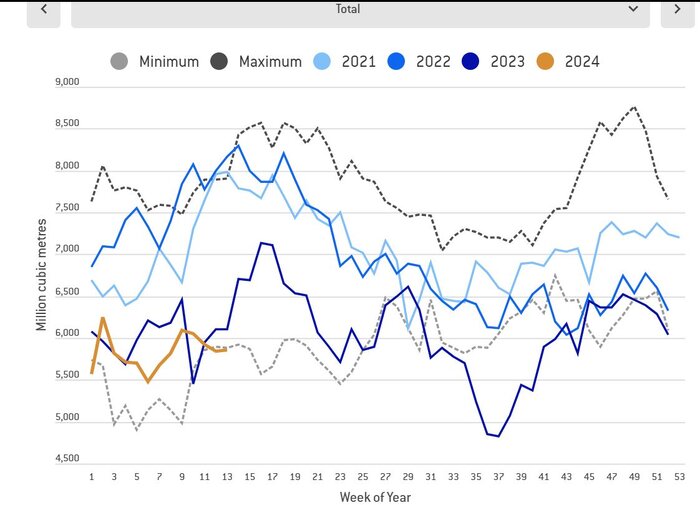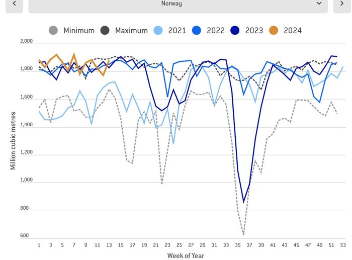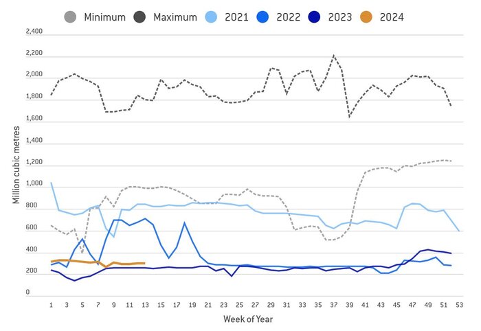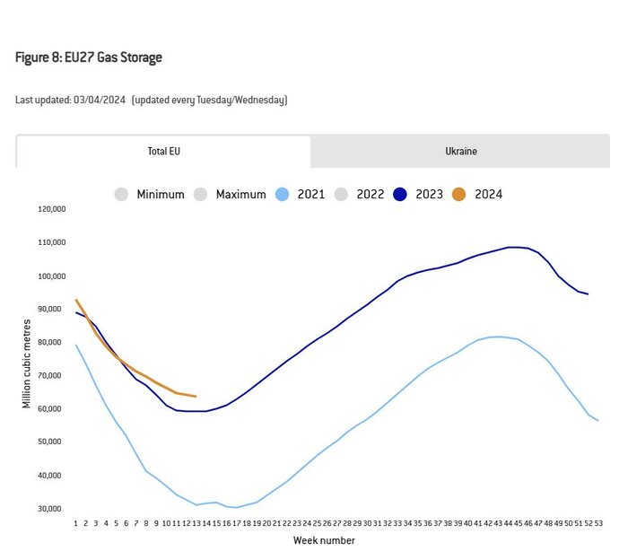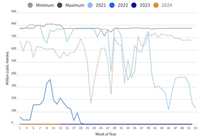 یکی از نکات جالب بررسی وضعیت کلان واردات گاز اروپا، افزایش ظرفیت ذخیره‌سازی گاز این قاره پس از کاهش واردات از طریق خط لوله این اتحادیه از روسیه بود، به طوری که در نمودار زیر می‌توان مشاهده کرد. چنانچه ظرفیت ذخیره سازی خود را از حدود ۱۰ درصد به ۱۲ درصد افزایش داده که نشان دهنده اهمیت ذخیره سازی است.