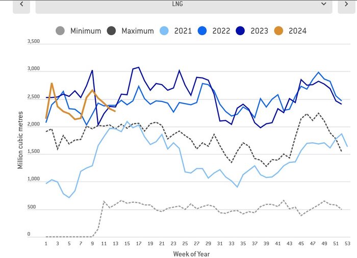 طبق نمودار بالا از طریق خط لوله روسیه حدود ۹۰ میلیون متر مکعب واردات گاز به اروپا در ۳۰ روز گذشته دارد و این واردات از مابقی کشورها با احتساب LNG برابر با ۸۵۰ میلیون متر مکعب در روز است که حدود ۳۵۰ میلیون متر مکعب آن به وسیله LNG صورت می‌گیرد.