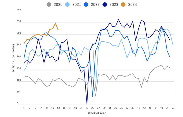 در شکل زیر داده‌های واردات گاز هفتگی در بازه‌های زمانی هفتگی از سال ۲۰۲۱ تاکنون به تفکیک مبادی وارداتی مقایسه شده است.