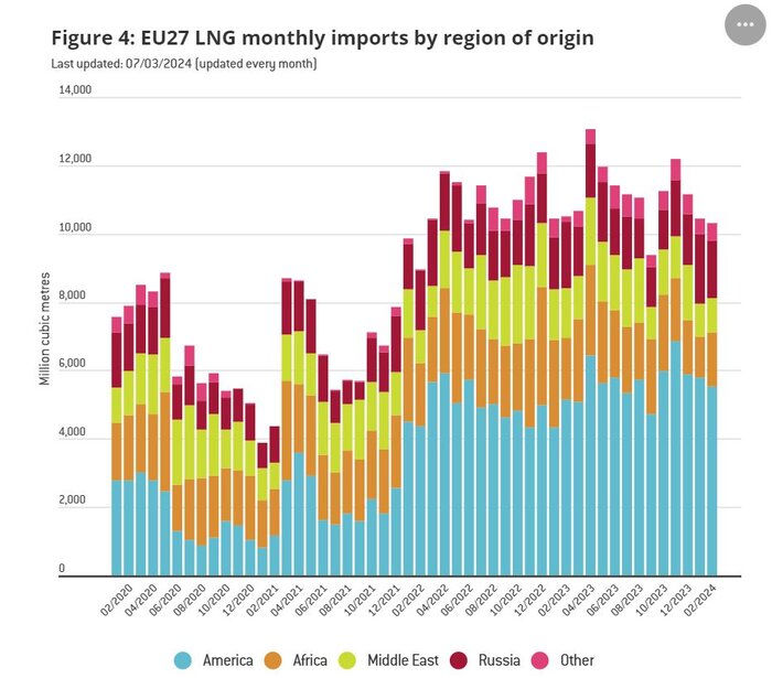از طرفی، بررسی واردات مختص به LNG، اتحادیه اروپا نشان می‌دهد هر چند صادرات گاز روسیه به اروپا از طریق خط لوله با کاهش مواجه شد اما صادرات این کشور به وسیله LNG تغییرات جدی را مواجه نبوده است.